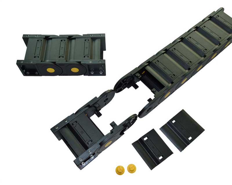 全封閉塑料拖鏈采用可拆卸的橋式接件,從頂部和底部快速鉤住和取下鉤子,所有中心都有橋梁。